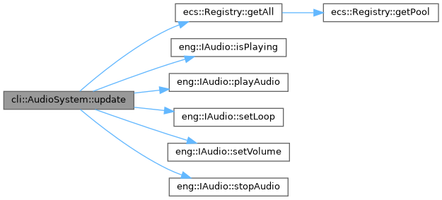 References ecs::Registry::getAll(), eng::IAudio::isPlaying(), m_audio, eng::IAudio::playAudio(), eng::Playing, eng::IAudio::setLoop(), eng::IAudio::setVolume(), eng::IAudio::stopAudio(), and eng::Stopped.