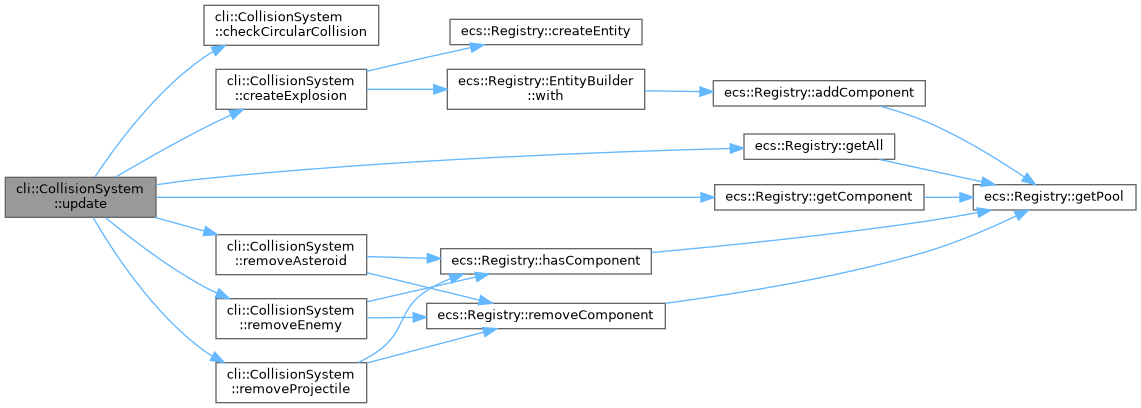 References checkCircularCollision(), createExplosion(), ecs::Registry::getAll(), ecs::Registry::getComponent(), removeAsteroid(), removeEnemy(), and removeProjectile().