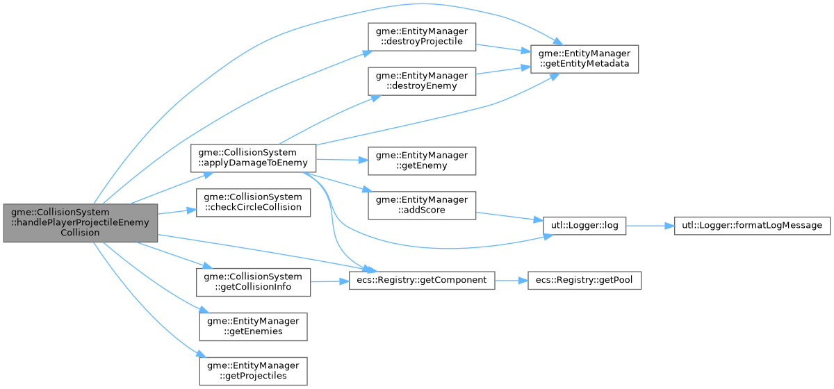 References applyDamageToEnemy(), checkCircleCollision(), gme::EntityManager::destroyProjectile(), getCollisionInfo(), ecs::Registry::getComponent(), gme::EntityManager::getEnemies(), gme::EntityManager::getEntityMetadata(), gme::EntityManager::getProjectiles(), m_collisionCount, m_entityManager, m_registry, gme::EntityMetadata::ownerId, and gme::PROJECTILE_PLAYER.
