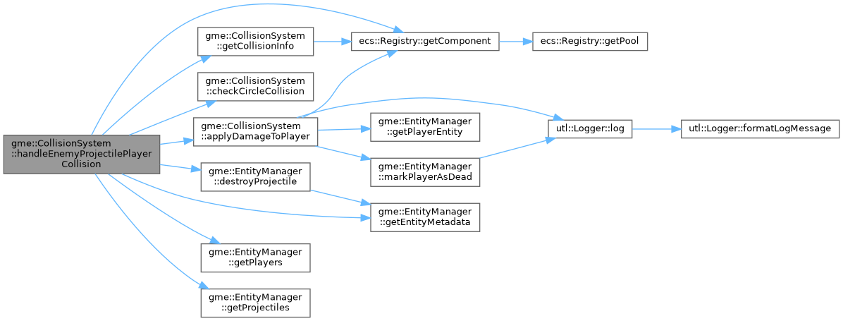 References applyDamageToPlayer(), checkCircleCollision(), gme::EntityManager::destroyProjectile(), getCollisionInfo(), ecs::Registry::getComponent(), gme::EntityManager::getEntityMetadata(), gme::EntityManager::getPlayers(), gme::EntityManager::getProjectiles(), m_collisionCount, m_entityManager, m_registry, and gme::PROJECTILE_ENEMY.