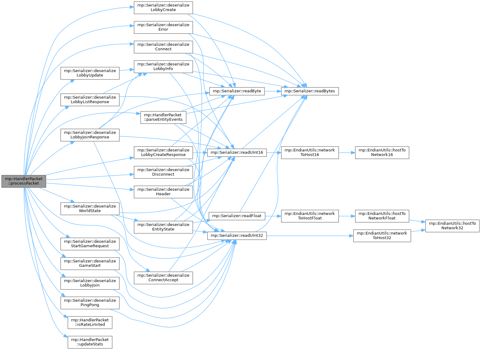 References rnp::CONNECT, rnp::CONNECT_ACCEPT, connectAcceptHandler_, connectHandler_, rnp::Serializer::deserializeConnect(), rnp::Serializer::deserializeConnectAccept(), rnp::Serializer::deserializeDisconnect(), rnp::Serializer::deserializeError(), rnp::Serializer::deserializeGameStart(), rnp::Serializer::deserializeHeader(), rnp::Serializer::deserializeLobbyCreate(), rnp::Serializer::deserializeLobbyCreateResponse(), rnp::Serializer::deserializeLobbyJoin(), rnp::Serializer::deserializeLobbyJoinResponse(), rnp::Serializer::deserializeLobbyListResponse(), rnp::Serializer::deserializeLobbyUpdate(), rnp::Serializer::deserializePingPong(), rnp::Serializer::deserializeStartGameRequest(), rnp::Serializer::deserializeWorldState(), rnp::DISCONNECT, disconnectHandler_, rnp::ENTITY_EVENT, entityEventHandler_, errorHandler_, rnp::GAME_START, gameStartHandler_, rnp::INVALID_PACKET, isRateLimited(), rnp::PacketHeader::length, rnp::LOBBY_CREATE, rnp::LOBBY_CREATE_RESPONSE, rnp::LOBBY_JOIN, rnp::LOBBY_JOIN_RESPONSE, rnp::LOBBY_LEAVE, rnp::LOBBY_LIST_REQUEST, rnp::LOBBY_LIST_RESPONSE, rnp::LOBBY_UPDATE, lobbyCreateHandler_, lobbyCreateResponseHandler_, lobbyJoinHandler_, lobbyJoinResponseHandler_, lobbyLeaveHandler_, lobbyListRequestHandler_, lobbyListResponseHandler_, lobbyUpdateHandler_, rnp::MAX_PAYLOAD, rnp::PACKET_ERROR, parseEntityEvents(), rnp::PING, pingHandler_, rnp::PONG, pongHandler_, rnp::PROCESSING_ERROR, rnp::RATE_LIMITED, rnp::PacketContext::receiveTime, rnp::PacketContext::sessionId, rnp::PacketHeader::sessionId, rnp::START_GAME_REQUEST, startGameRequestHandler_, rnp::PacketHeader::type, rnp::UNSUPPORTED_TYPE, updateStats(), rnp::WORLD_STATE, and worldStateHandler_.