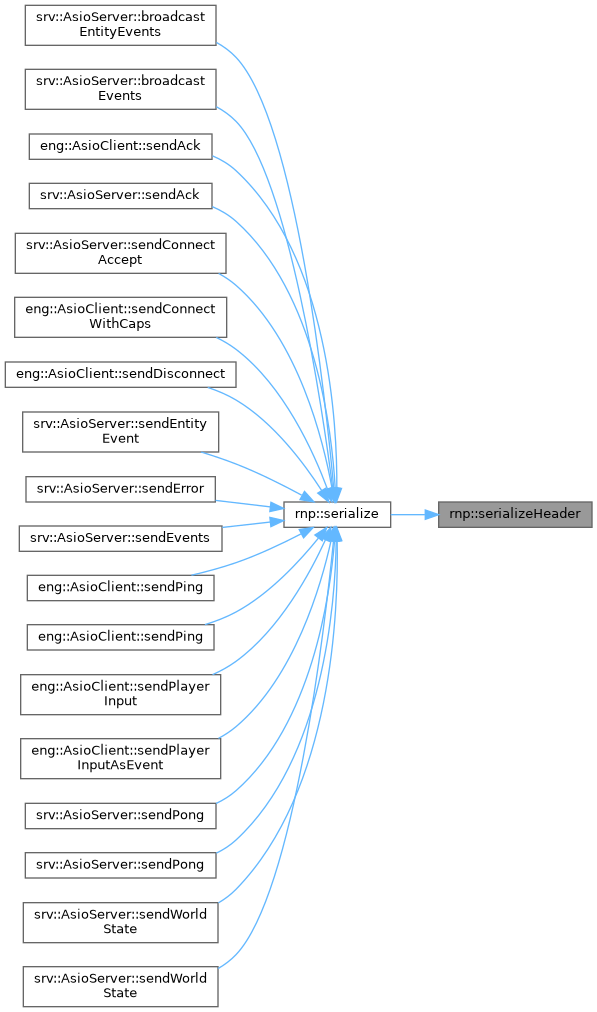 Referenced by srv::AsioServer::broadcastEntityEvents(), srv::AsioServer::broadcastEvents(), eng::AsioClient::sendAck(), srv::AsioServer::sendAck(), srv::AsioServer::sendConnectAccept(), eng::AsioClient::sendConnectWithCaps(), eng::AsioClient::sendDisconnect(), srv::AsioServer::sendEntityEvent(), srv::AsioServer::sendError(), srv::AsioServer::sendEvents(), eng::AsioClient::sendPing(), eng::AsioClient::sendPing(), eng::AsioClient::sendPlayerInput(), eng::AsioClient::sendPlayerInputAsEvent(), srv::AsioServer::sendPong(), srv::AsioServer::sendPong(), srv::AsioServer::sendWorldState(), and srv::AsioServer::sendWorldState().